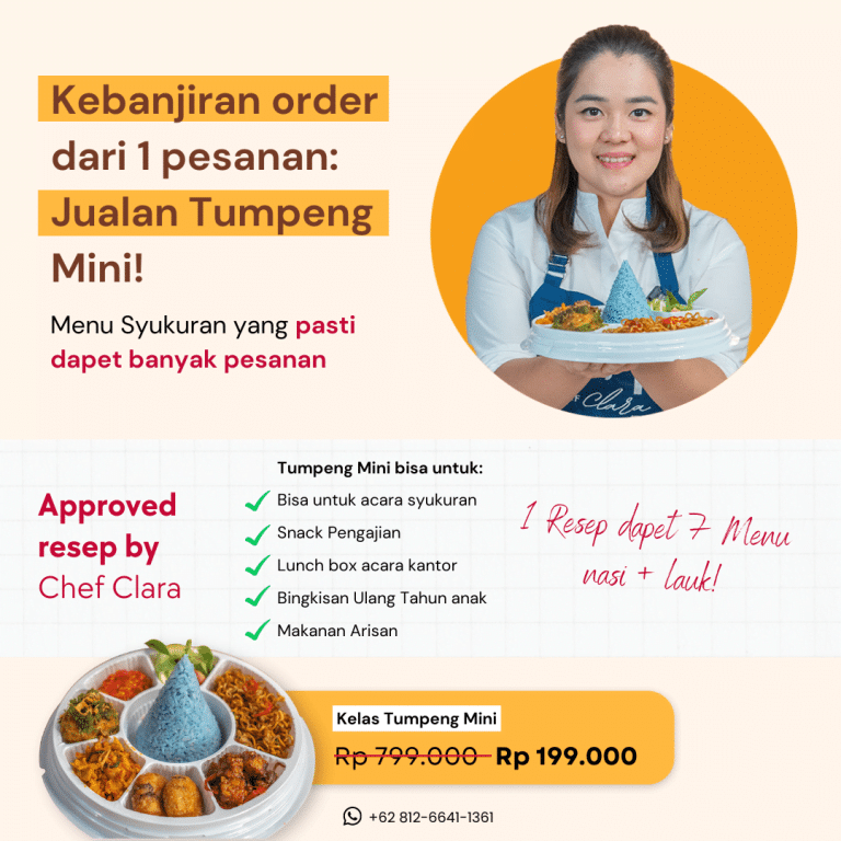 Tumpeng jadi sajian yang wajib ada di setiap acara, peluang bisnis dari bisnis tumpeng mini menjanjikan banget. Disini Chef Clara akan berbagi resep tumpeng biru tanpa pewarna buatan tapi warna berasal dari bunga telang, dan rahasia tumpeng bisa tetap kokoh saat dibentuk siap dibagikan!